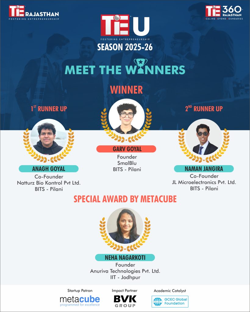 TiE Rajasthan launched it’s 5th edition of TiE U, a global initiative designed to support and empower collegiate startups. As part of this ground breaking program, TiE Rajasthan is offering an Equity-Free Grant of $7500 to the winning team, providing them with a significant boost to accelerate their startup journey. Additionally, the top 15 teams will receive exclusive access to TiE Global Summit – 10th Edition, unlocking unparalleled opportunities for networking, mentorship, and funding.